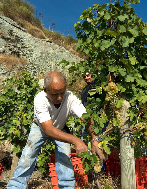 The harvesting period varies according to the altitude of vineyards from sea level to 700 meters (1,640 feet) and begins in the last ten days of August and ends in the first ten days of October. Harvesting in Ischia island does not respect the classic canons of grape cutting of many Italian wine areas. It is fundamental to respect the ripening period and the multitude of varieties of grapes according to the slopes, the altitude and the different cultivation systems. Most of the cultivation operations are carried out by hand, and in some areas, given the slope, we help ourselves for the ascent of the boxes with a monorail that runs about 600 m on the west side of Mount Epomeo (789 m) from the collection points to the loading point.