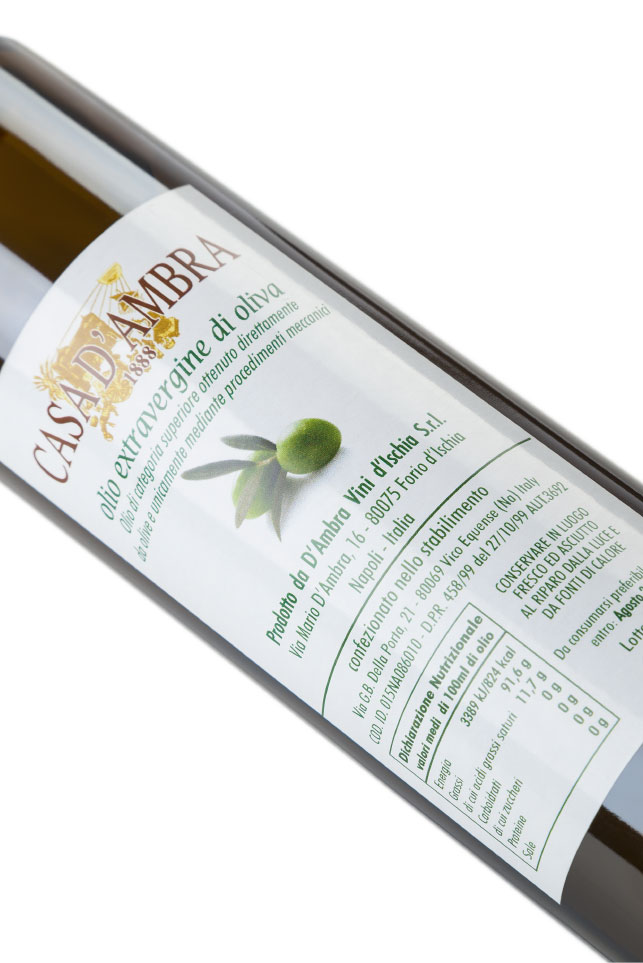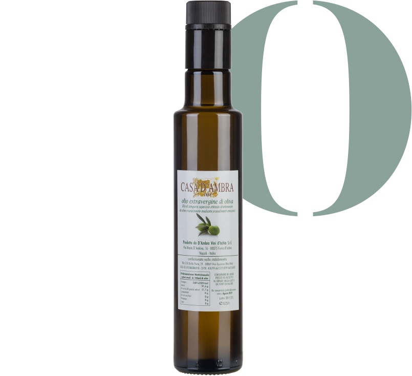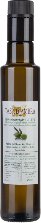 The olives of Casa D'Ambra's olive oil are harvested between October and December from olive trees of an average age of 50 years. The varieties are Leccina, Frantoio, Ravece and grow on the Montecorvo estate. From here, the olives are then transported to the oil mill and processed with the method of semi-integral pressing, cold extracted, so as to ensure a extra virgin olive oil of superior category, obtained directly from olives and only by mechanical procedures